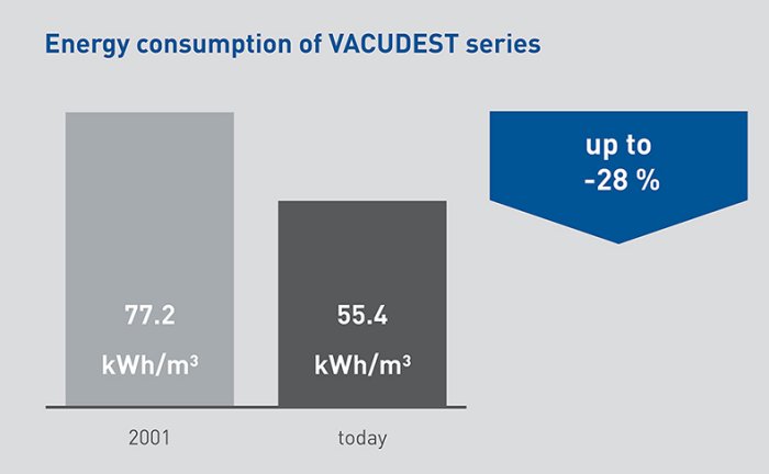 One of our goals, as we continue to further develop our VACUDEST wastewater evaporator systems, is to improve energy efficiency. We provide for optimal heat transfer from the steam to the wastewater. Also the residual heat in the distillate is used efficiently to pre-heat the wastewater entering the system. In the last 10 years we could reduce the average energy consumption in our VACUDEST wastewater evaporator systems by 28 percent. Our modern VACUDEST wastewater evaporator systems stand for highest energy efficiency and lowest operating cost.