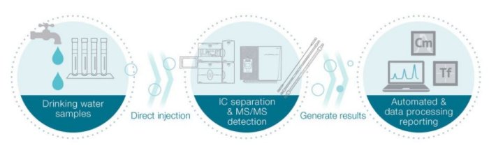 Water samples can be directly injected into the IC system for separation and subsequent MS/MS detection. Automated data processing and reporting are used to generate results.