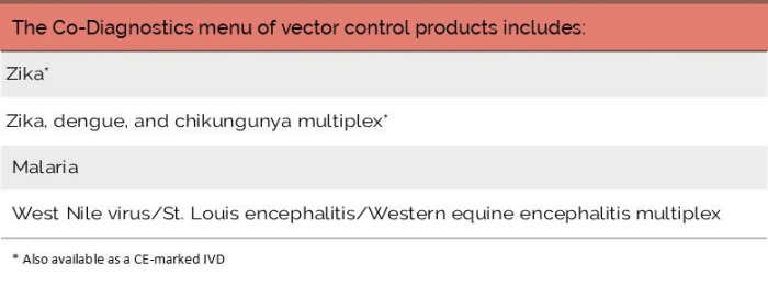 Ministries and Departments of Health in the U.S. and worldwide currently have vector control services to control, limit, or eradicate vectors where they are suspected to contribute to the spread of pathogens or outbreaks. Vector control and mosquito abatement play a vital role in preventing outbreaks and the spread of mosquito-borne diseases. Co-Diagnostics tests have been engineered with positive controls for either human or mosquito samples, ensuring reliable results.