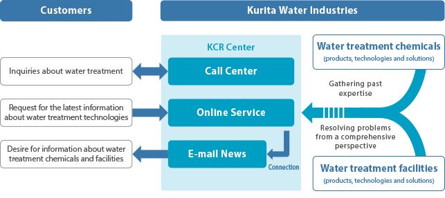 Kurita has established the Kurita Customer Relationship Center (KCR Center) as a support center for addressing and resolving the water treatment-related issues of customers through the use of its own accumulated water treatment technologies and expertise.