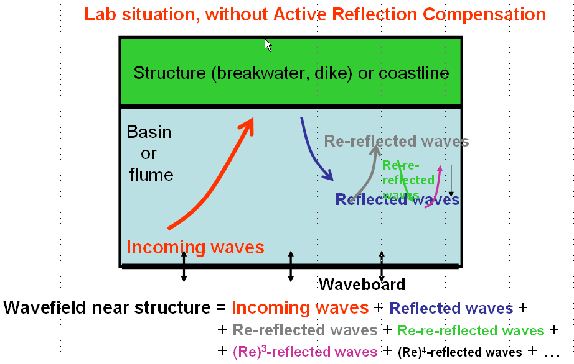 - The unwanted part. This part consists of the re-reflected waves (reflection of the reflected waves at the wave board), the re-re-reflected waves (reflection of the re-reflected waves at the structure), the re-re-re-reflected waves (reflection of the re-re-reflected waves at the wave board), and so on.