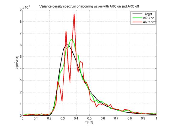As mentioned above, the un-wanted re-reflections can cause a significant amount of undesired wave field ‘pollution’. The figure shows a target spectrum (in black) and two measured spectra. The green line is obtained with ARC on, while the red line is obtained with ARC switched off. The strong spurious peaks occur at the resonance frequencies of the basin. These peaks constitute significant deviations from the target wave field.