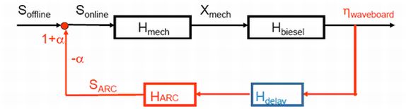 Here, is the offline wave board signal as computed by AukePC/Generate. The ARC correction is added to the offline signal, leading to the online signal . The factor , which is unity by default, controls the relative influence of the ARC motion on the total signal. The wave board signal leads to a mechanical motion of the wave board, with representing the mechanical transfer function. The motion of the wave board leads, through the Biésel transfer function, to a target incident wave . The measured total wave signal at the wave board, , contains not only the target incident wave ( ), but also the reflected wave . The latter needs to be absorbed. This is done by suitable adjustment of the total wave board signal. The ARC routine computes the required correction to the wave board signal.