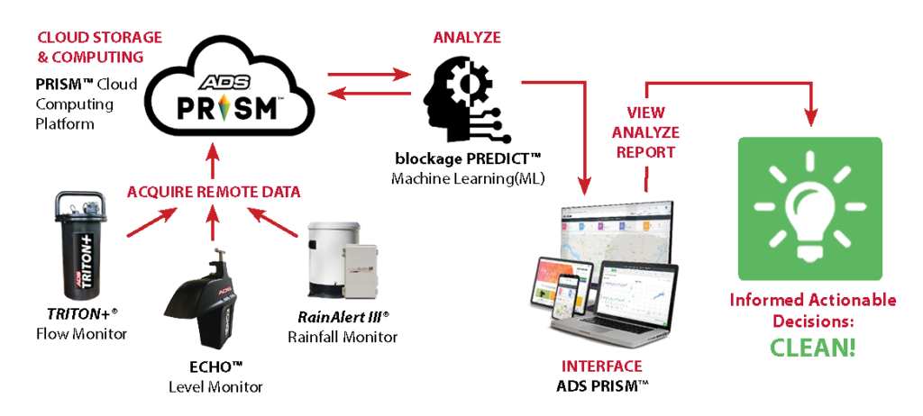 Blockage PREDICT combines many elements to deliver a simple answer. Where will a blockage form? An ADS ECHO level monitor is installed upstream from a location of interest, measuring sewer flow depth at regular time intervals. This data is transmitted periodically to the Cloud, where a machine learning (ML) algorithm evaluates the data – looking for tell-tale signs of developing blockages. You can access the results in the PRISM™ online platform from any device. Blockage PREDICT predicts developing blockages with enough notice to plan a proactive response with the right resources at the right time to prevent an overflow before it occurs.