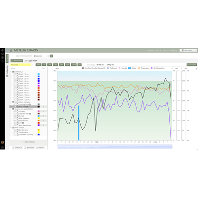In addition, weather data (and soil moisture probe, dendrometer and other sensor data if available) can be used to generate charts for any time interval from the current day up to 1 year.