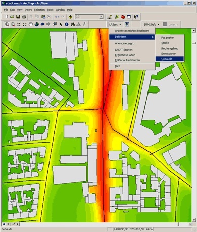 The lagrangian dispersion model LASAT, developed and distributed by Ingenieurbüro Janicke, is being employed by IVU Umwelt GmbH in addition to IMMISnet to calculate pollutant dispersion. LASAT is a complex model for calculating concentrations of air pollutants, taking into account e. g. orography and building structures. It is based on the same algorithms as AUSTAL2000 and is in accordance with the new German directive on air pollution modelling TA-Luft. In studies for large areas with many emission sources, the generation of input data in the required formats is often tedious. The use of a GIS for the automatic generation directly out of GIS-data is practically indispensable. Therefore, IVU Umwelt has developed the ArcGIS-Extension LASarc.
