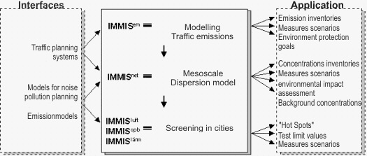 IMMISmt consists of several modules that can be combined according to specific requirements. Due to its design, IMMISmt can be connected to a variety of data interfaces (e. g. OPCI) within existing IT-infrastructures. IMMISmt is scaleable, thus able to process data for a few streets as well as extensive road networks of lager cities or conurbations. Within IMMISmt, all input and output data is stored in a database. Depending on specific requirements, the database can be both file-based or a client/server database management system.