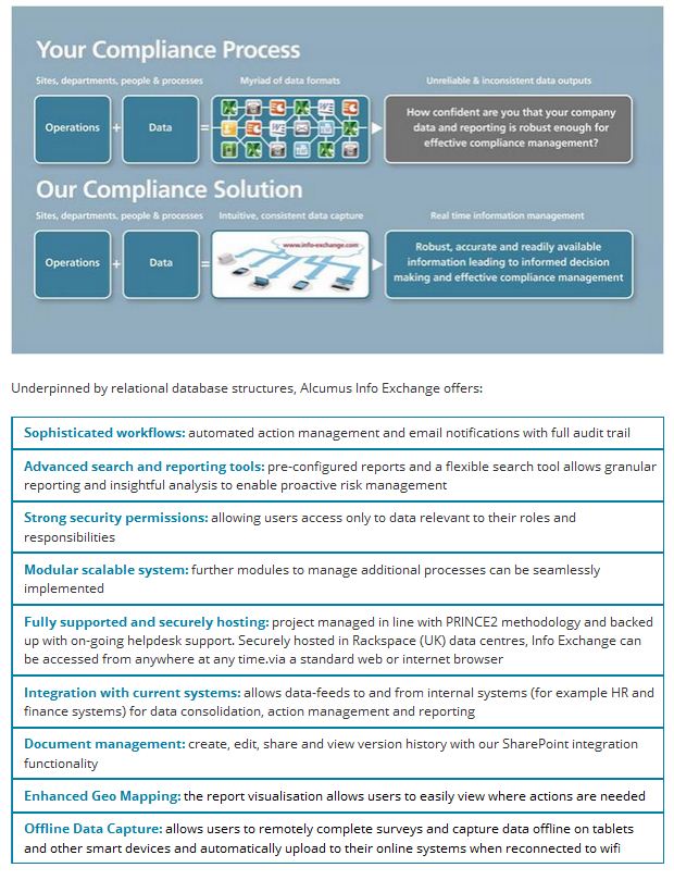 Alcumus Info Exchange is a ‘multi-application’ software platform which provides organisations with both top-level and tailored views of their business data from a central source. This allows them to pre-empt and mitigate potential risks, meet their legal compliance obligations and ultimately make more informed management decisions based on robust data. Alcumus Info Exchange can be used to interrogate all kinds of management data including: accident and incident management, property compliance, safety, health and environmental management, loss prevention, audits and inspections and supply chain management.