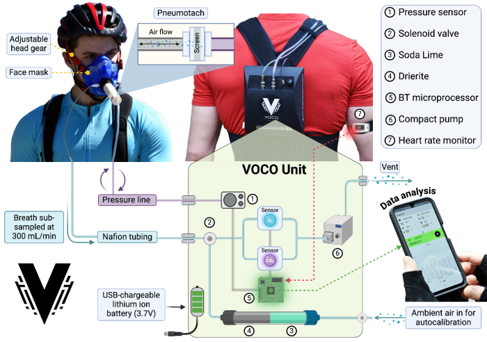 At a user-defined frequency, the O2 and CO2 analyzers are automatically calibrated by switching the solenoid valve so that the pump draws dry, CO2-free ambient air into the analysis system via a gas conditioning column containing soda lime and Drierite. All data are processed onboard the VOCO unit using a Bluetooth microprocessor, which transmits data to a smart-phone application for visualization. Data are also stored on an SD card and backed up on a cloud-based storage system accessible only by the subject.