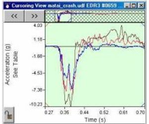 DynaMax Suite Cursor View with three impact waveforms from three different recorders, superimposed to show the transfer of energy from one vehicle to another.