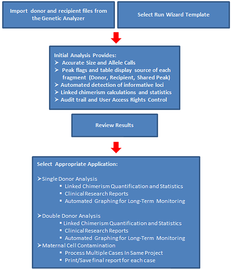 ChimeRMarker software includes functions for comparison of samples at different time points to conduct longitudinal studies for monitoring each individual and a comprehensive chimerism analysis report. The chimerism analysis performs repetitive calculations (using published methods. Dr. Don Kristt).