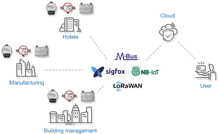 AUTOMATIC METER READING MODULEThis compact device mounted close to the meter collects data from the meter using a communication protocol such as wired M-Bus, wireless M-Bus OMS, Mod-bus, LoRaWAN, Sigfox or NB-IoT technology.