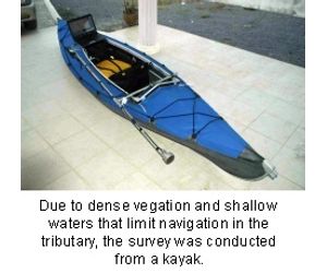A pole mount was constructed and attached to the kayak to hold the transducer, GPS and sonde (Figure 1). The operator followed a survey path that zigzagged from shore to shore as he made his way upstream and covered a linear distance of approximately 5 miles. Streamline-GEO automatically acquired data from the echo sounder, sonde and GPS and displayed the data, scaled by color, on the GIS map. The vessel location and survey track are also displayed on the GIS map. A status board shows the instantaneous water depth, geographic position, vessel speed and heading along with Quality Indicators for each parameter.
