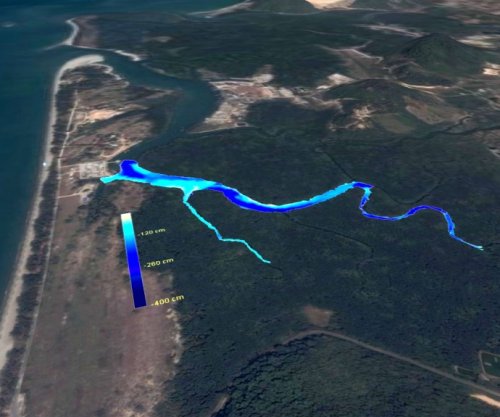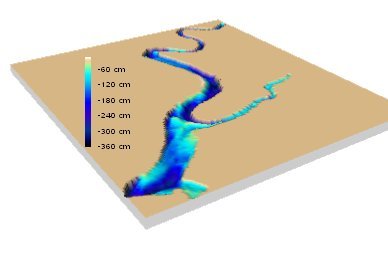 Bathymetry data collected during the Kaper Bay survey is represented in the first two figures and water temperature in the last figure. In the first figure the data is shown as a color scaled contour map overlayed on a geo-referenced satellite image of the survey area. A 3-dimensional color-coded representation of the hydrography is shown in the second figure. The hydrographic data is used in flooding models to enhance disaster management and evacuation planning.