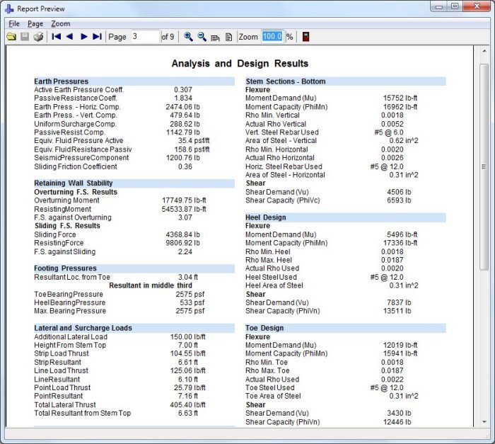 We had to make a decision of showing each calculation step with many pages of output or showing enough output but to concentrate on geotechnical checks and structural detailing. We chose the latter. This SoilStructure retaining wall software uses ACI 318-14 provisions and dynamic diagrams to show the bars & detailing including calculation of Temperature & Shrinkage Bars. You get a 7 to 9 pages report output to document your retaining wall calculations.