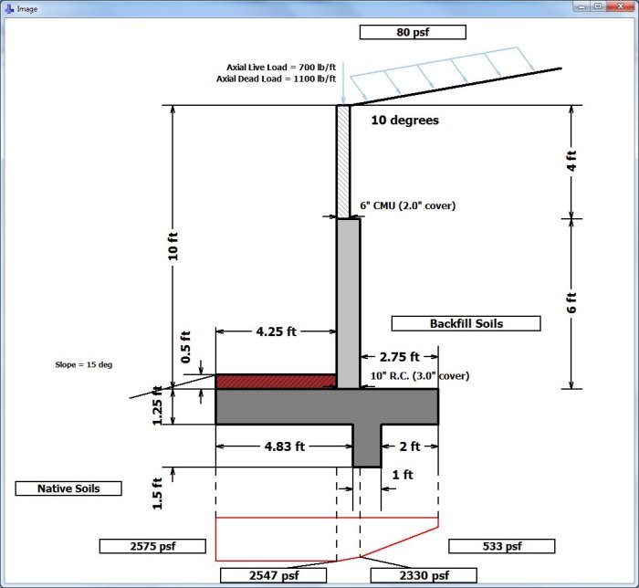 Other times we need to design a property line retaining wall. Often this has approximately 2 ft of backfill on both side and about 6 ft of fence wall. When such situations are encountered, you need to design the upper portion of the stem wall with wind pressure that can come from either direction. Therefore we balance the retaining wall footing dimensions of Heel and Toe.