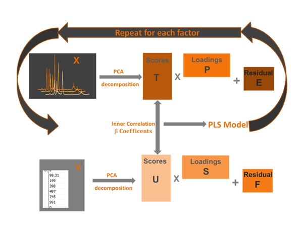 The PLS method is related to Principal Component Analysis (PCA), where data is screened for correlations, each correlation being described by a Principal Component or factor. The algorithm will attempt to find factors which describe covariance (how variables vary within relation to each other) and achieve correlation between wavenumbers and spectral absorbance or concentrations. The PLS model will find combinations of wavenumbers which maximise the variance, but only the variance which is relative for predicting the concentration.