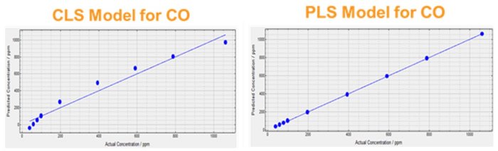 CLS modelling will provide a linear model of all the species that the model is built to include. If a substance not present in the model is in the sample, then the model will fail in its predictions. If a substance with a non-linear response of absorption vs. concentration is attempted to be model, a non-linear resulting model will be produced. CLS models are quick to build, to edit and to add new calibrations too and are a relatively simple method for applying to Mid-IR gas phase analyses.