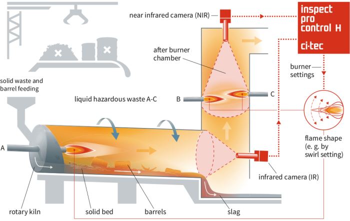 IR-based optimization of temperature distribution and combustion behavior. inspect pro control H acquires the image data from infrared cameras which can cover all the way into the feed of the rotary kiln, depending on the spectral range. inspect pro control H inspect pro control H then uses these characteristic values to optimize incineration process control. The new parameters are transmitted to the process control system on a cyclical basis.