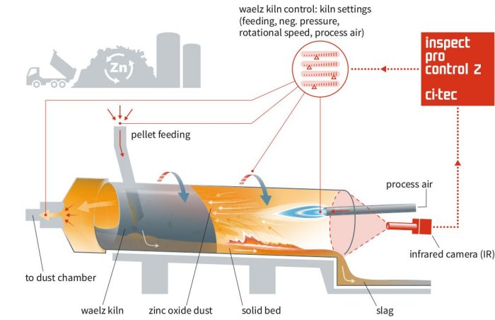 The inspect pro control Z system can be used to retrofit all standard waelz kiln plants. A high pro tability of the system is ensured by reduced coke consumption, higher metal yield, and extended service life as a result of reduced slag deposition.