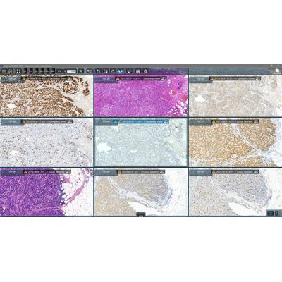 CaseManager‘s integrated ClinicalViewer application offers the unique feature of the parallel view of up to nine slides on a single screen. It also offers automatic slide alignment, synchronization of serial sections and advanced annotation options. The viewer displays patient ID and staining information to avoid case confusion.