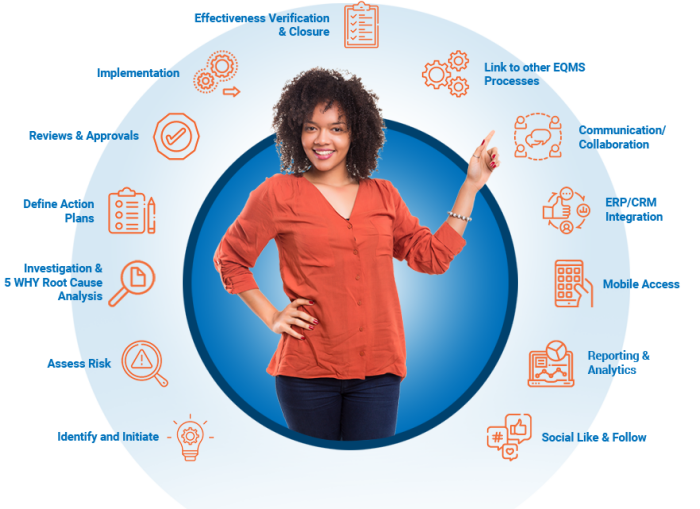 There are eight key processes in a robust quality management system. These include Nonconformance, Customer Complaints, CAPA, Equipment, Product and Process Inspections, Workforce Digitalization, Audit/Risk and Compliance, and Supplier Management. The key to address any quality issue at a system level is to have an unified QMS that is connected end-to-end. CQ CAPA Management Solution integrates with the rest of the quality processes making it easier for the quality leader to collaboratively implement action plans and verify the effectiveness of a CAPA.