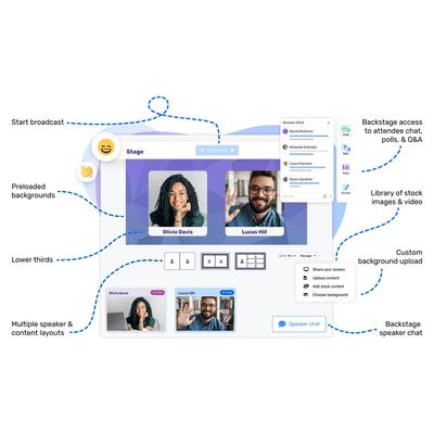 - Simplify your speakers’ experience with a backstage, speaker-only chat, and access to the attendee chat, Q&A, and polls