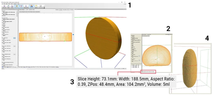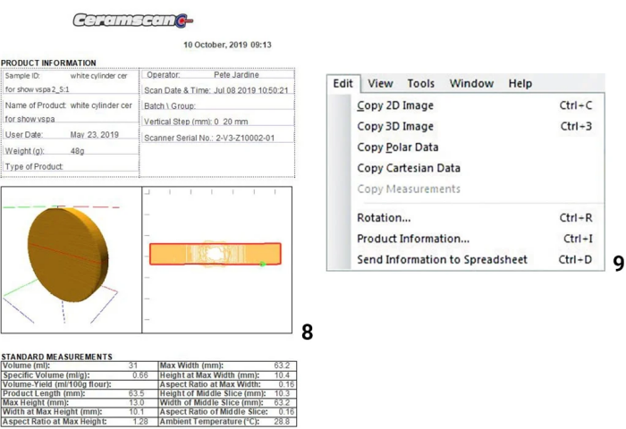 Once the test is complete a full set of dimensional measurements are quickly displayed (as shown above). The scanned data can be viewed in both 2D and 3D representations to allow comparisons with previous archived measurements or exported as .stl files for viewing in popular CAD packages. Within the 2D sectional view, additional automatic and manual measurements can be made on chosen intervals or `slices` of the test data [2/3]. 3D views of the product are rotatable in all planes providing flexibility of viewing for visual comparison and presentation [4].