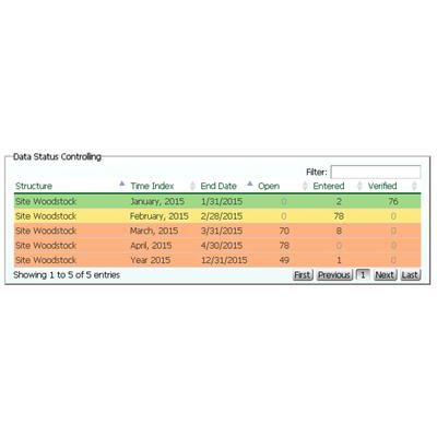 It`s essential for verifiers and analysts to know how far the data collection and verification progress is at any given time. Therefore, similar to the Pending Data Entry task list on the dashboard, they receive an overview of all the structures which they are overseeing right after login on the dashboard. Just like everywhere in the application, the Data Status Controlling applies a color code of the least status in the selected item. The green bar in the following screenshot however is the currently selected row.