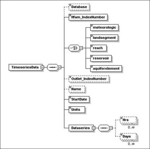 The schema for HFAM II XML daily and hourly timeseries files (timeseries.xsd) is shown below.