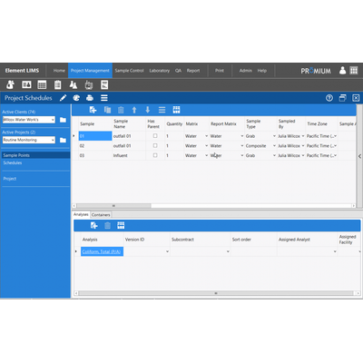 Element LIMS functionality is developed to support analytical testing laboratories, including: