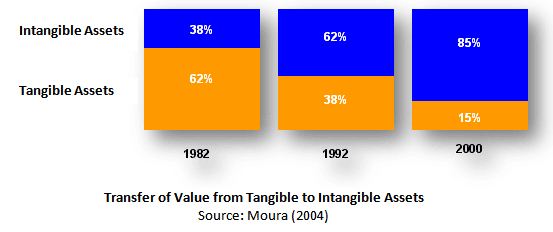 From 1850 to around 1975, the sustainable competitive advantage of industrial organizations was related exclusively to the benefit of economies of scale and scope, rapid allocation of technology, fixed assets and excellence in the management of financial assets and liabilities in an economy dominated by tangible assets. This economy was based solely on financial indicators for performance management, no longer applicable today because organizations have transferred their assets to tangible assets, as shown in the figure below: