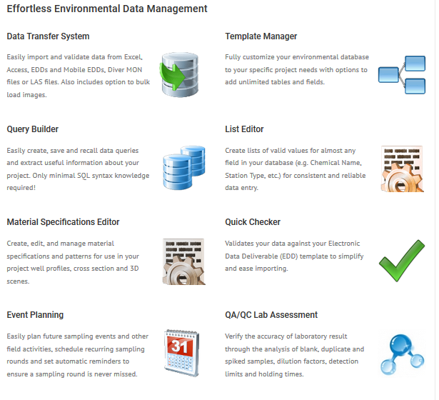 Hydro GeoAnalyst helps you kick start your project by providing an environmental database template that consist of tables and fields for common environmental data types, common well profile templates and report templates.