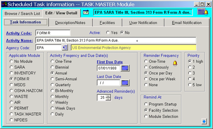 Entries for environmental activities may include a complete description, due date, activity frequency, reminder levels and priorities. Task messages and automatic reminders can be sent through the MIRS™ or via email.