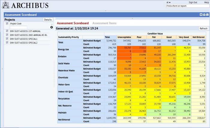 An increasing number of organizations are recognizing the strategic value of reducing their carbon footprint to protect the environment and enhance their bottom line. Web-based ARCHIBUS Environmental Sustainability Assessment helps make the concept of environmental sustainability a reality by tracking, ranking, and documenting details on the condition and use of physical assets so remedial action can be taken. Unlike spreadsheets and other manual processes, the application provides a truly objective and systematic method of identifying and prioritizing facility replacements, upgrades, and renovations, based on environmental sustainability criteria while leveraging other ARCHIBUS facilities data from its central repository.