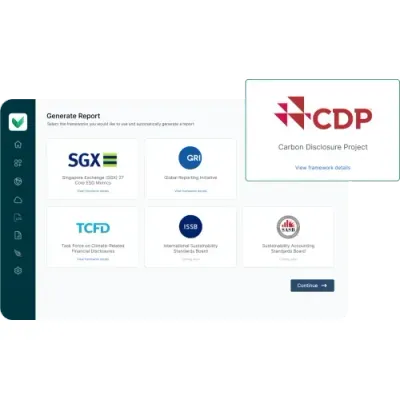 Create disclosure-ready reports in minutes, supporting multiple global ESG frameworks such as GRI, CDP, TCFD, and more. Answer once for questions that align across different frameworks.