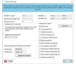 Meteorological data stored in the CALMET output files can be extracted from a specific point and represented as time series. The vertical level of the extraction may be one of the CALMET vertical levels. The user selects what variables must be extracted (e.g., wind, temperature, mixing height, stability class, ...). The charts can be copied or saved and used in technical reports.