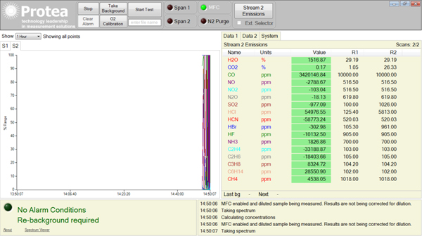 All the spectra are saved for a pre-determined time interval (usually 2 months), analysed in real-time and the data is outputted via 4-20mA, OPC or ModbusTCP protocols. The user interface is made up of a single window, often on a dedicated panel PC built into the system. Here via touch-screen the engineer can enable stream switching, zero purge, span check or background the system.