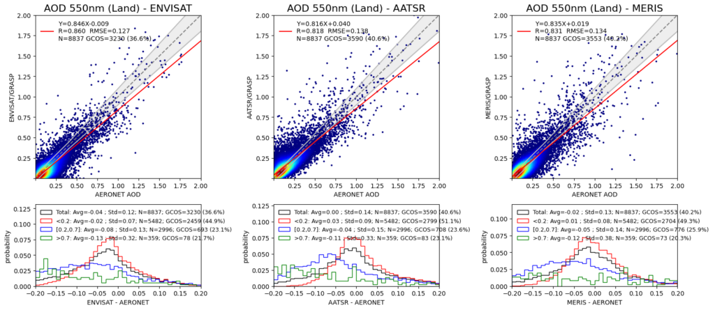 In addition, an optional activity of this project is to update the MERIS/GRASP and to extend the AATSR/GRASP retrieval schemes and to process the full archives of MERIS and AATSR individually to generate an updated MERIS/GRASP dataset and a new AATSR/GRASP data set. These data sets are expected to be analyzed individually and compared to the synergy MERIS+AATSR data with the purpose of improving the understanding of the information content of each instrument and the value added of MERIS+AATSR synergy processing. These individual products will serve the community when they want to use a single-instrument data set, e.g. for intercomparison exercises.