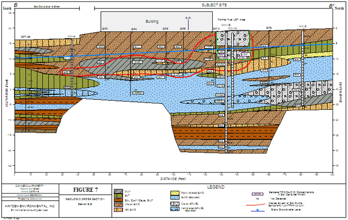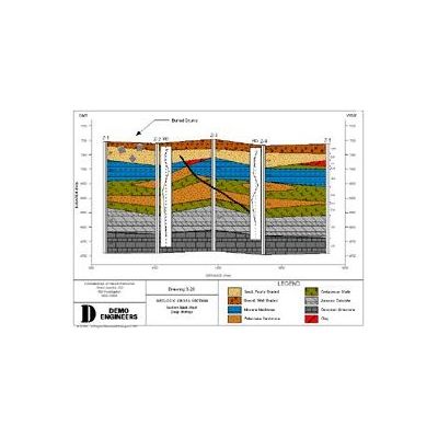 After two or more borings have been added to a list, you can immediately preview your cross section or fence diagram. Below is a cross section generated from the list above. Each geological layer is marked with its fill pattern abbreviation (ex. SM). In minutes, you have a basic cross section drawn perfectly to scale. Accomplishing this task in CAD would take hours.