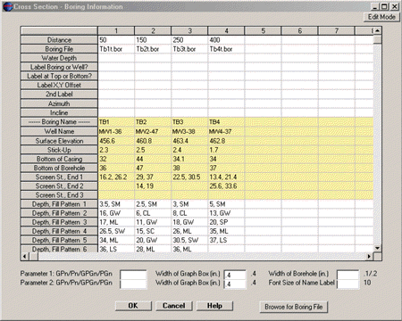 The data from QuickLog is easily imported into QuickCross and QuickFence. With a click of a button, you add borings to your cross section or fence list. You can also create cross sections or fence diagrams without using QuickLog by entering the geologic layer data directly into the editor. Below is the cross section data for 4 borings: