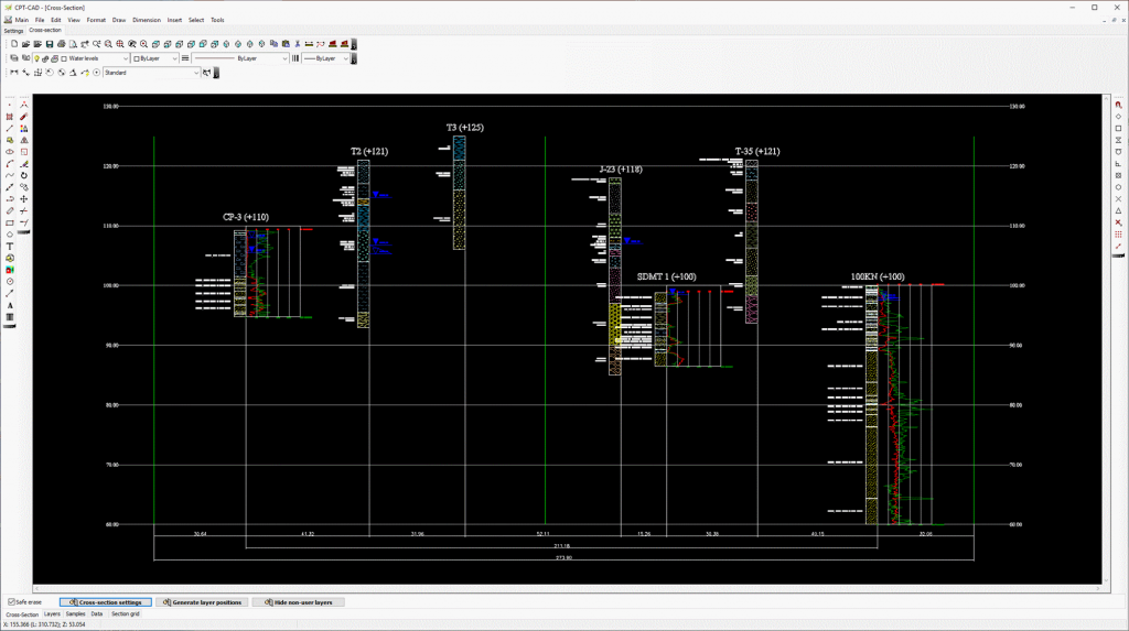 Geological cross section and geotechnical cross section can be made in the CPT-CAD program. It contains a set of tools enabling automatic generation of geological and geotechnical cross sections and maps based on information contained in interpreted CPTU soundings and information contained in the geological and geotechnical database GEO DB.