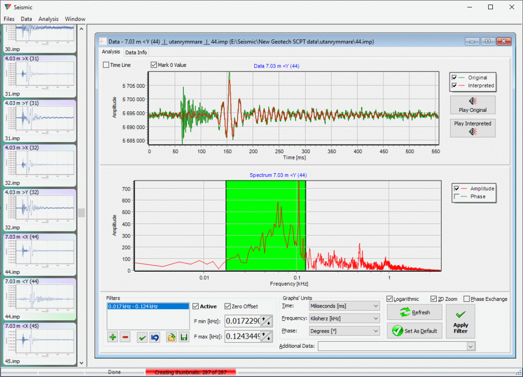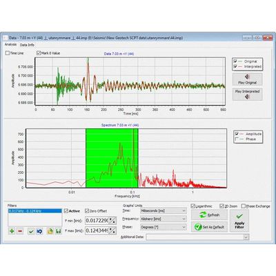 SEISMIC-pro software allows User to filter, analyze and interpret raw SCPT data generated in seismic test, as well as to generate reports with results of analysis. Implemented editor of mathematical formulas (under construction) allows User to generate own interpretation formulas and calculate geotechnical parameters. The current status of analysis can be saved in project, so the analysis of results saved in one hole (sometimes 30-40 tests) can be divided into few phases and continued any time. Presentation of the seismic wave spectrum allows for verification of the correctness of the recorded amplitude and selection of the optimal filtering frequency range.