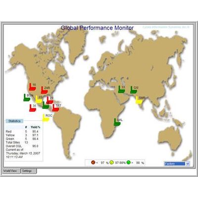 The number of plant sites that may be viewed is unlimited. Customize your view. Choose which manufacturing or distribution plant sites to monitor and display. Each site is automatically displayed from LQATS as audit and inspection product information is entered over your worldwide enterprise. Plant sites may be grouped for easier analysis and viewing. Drill Down audit performance. Clicking on an icon representing one of your plant sites will display recent quality performance at the site. The graphical information may then be exported or printed. Detail your view. Select a group of sites to view performance summaries from the on page display. Select how often to poll the LQATS database for performance information.