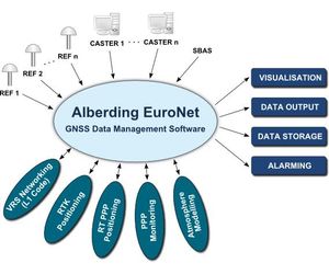 Depending on the user application, EuroNet calls additional,external software modulesresponsible for data processing, modelling and statistical computations. The Alberding GNSS Status software has a variety of external modules, e.g. DGNSS/RTK positioning, real-time or post-processed PPP positioning, L1 VRS networking and real-time PPP-based troposphere modelling. Customer provided executables can also be integrated into the monitoring system.