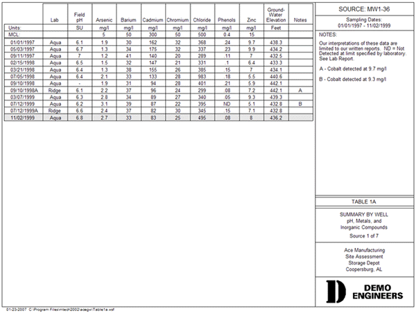 The Source Summary table shows the sampling history data for each source (ex. well, lagoon, etc.). One source is shown per page. You choose the parameters to be shown across the top, and the sampling dates are listed down the left side.