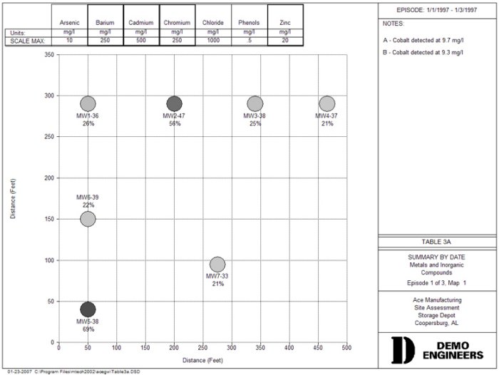 The Date Summary report shows the plume of contamination for a set of sources during one sampling episode. The report for each episode consists of a table page and up to 10 map pages. The map page shows the sources in their physical locations on the site. Each source area is shaded according to the level of contamination of the parameters chosen. Click on the drawing to enlarge it.