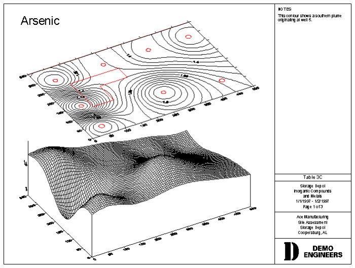 The Date Contour map links directly to Surfer to produce 2-D and 3-D contour maps. Once setup, this process saves hours over using Surfer to manually generate maps. Click on the drawing to enlarge it.