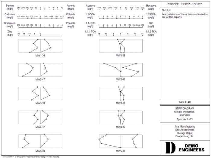 Like the Date Summary report, the Stiff Graph report shows the values for parameters and sources during one sampling episode. The parameters and their scales are shown at the top of the page. Each point on the polygons, below, is placed according to the value for each parameter, relative to its scale, above. Thus, the higher the value, the larger the polygon. This report gives you a way to quickly summarize concentrations of multiple of parameters in multiple sources. Click on the drawing to enlarge it.