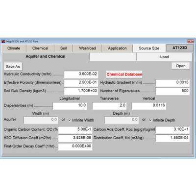 AT123D is a generalized three-dimensional groundwater transport and fate model. AT123D is an acronym for Analytical Transient 1-, 2-, and 3-Dimensional Simulation of Waste Transport in the Aquifer System. It simulates contaminant transport under one-dimensional groundwater flow. Transport and fate processes simulated include advection, dispersion, diffusion, adsorption, and biological decay.